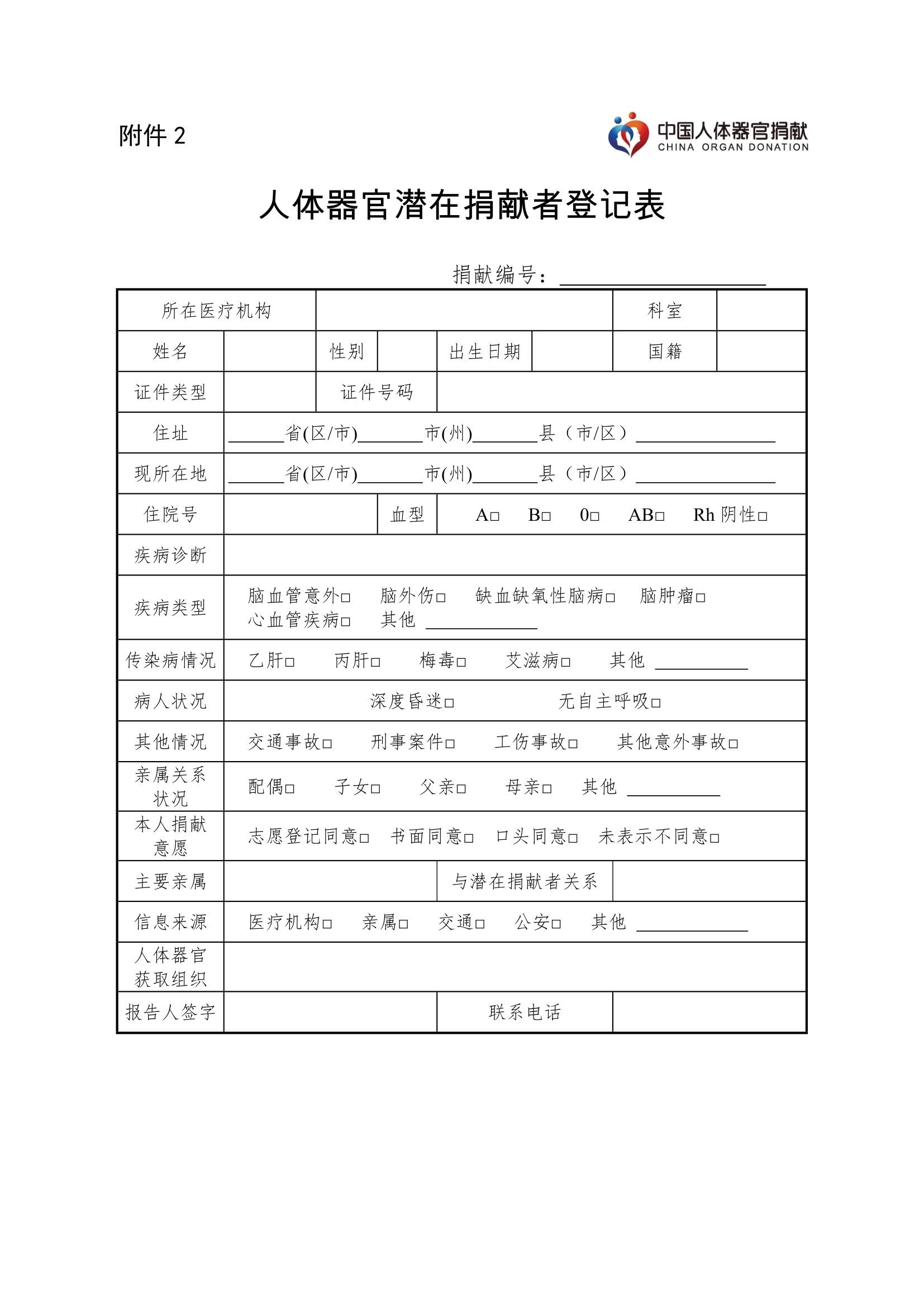 第十五条 人体器官获取组织负责潜在捐献者发现,采集《人体器官潜在捐献者登记表》(附件2)相关信息并收集相关佐证材料,录入登记信息系统并报告省级管理机构。